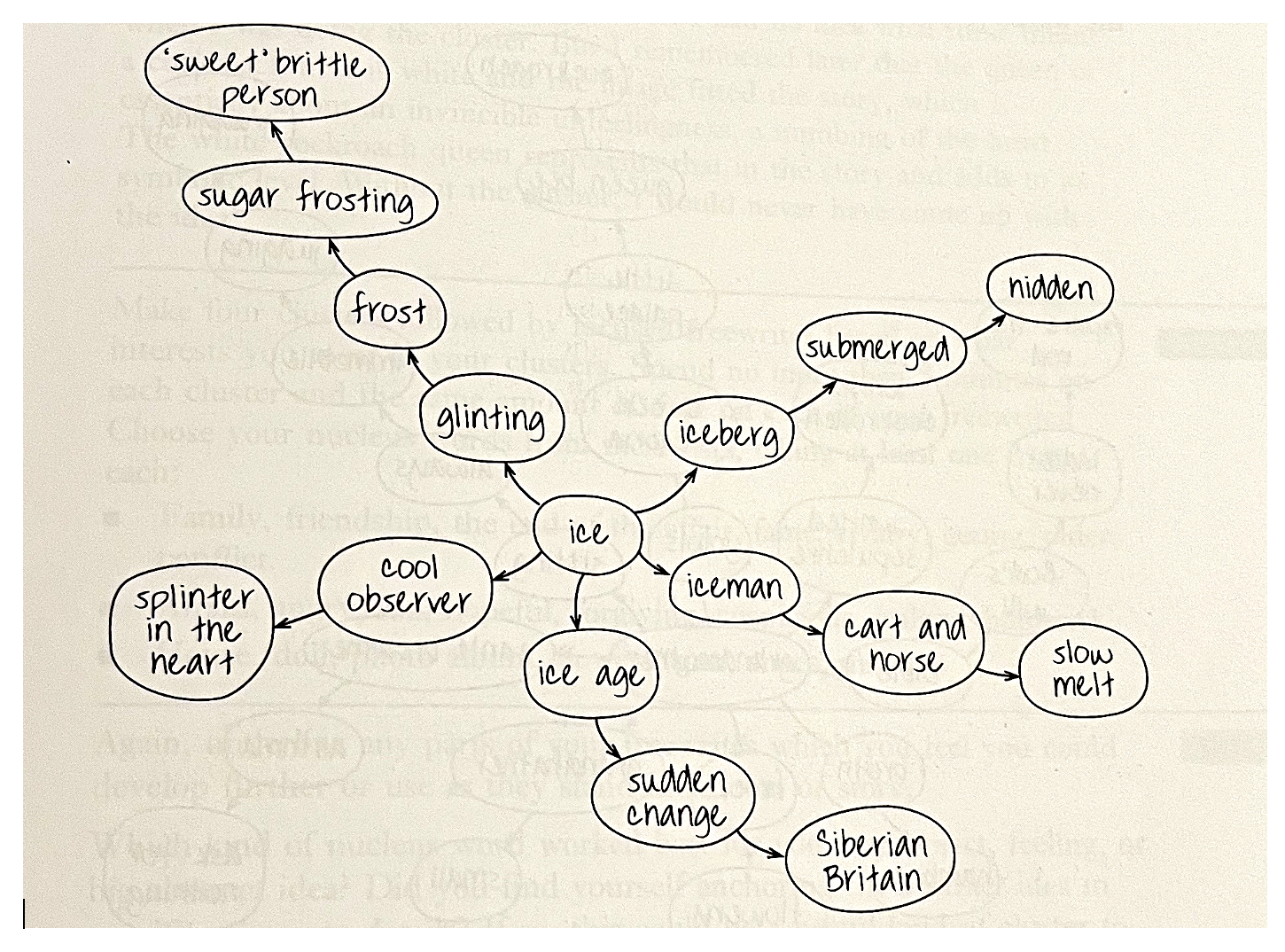 This activity reminds me of “brainstorming”, because you can use similar pictorial images in either process. Clustering is a way of launching into a “focussed freewrite”, i.e.: one where you choose the subject. It provides a visual map of your thoughts, and helps you organise them organically rather than sequentially. Use it to trigger your writing. Once you start, you may find you only wish to use a few or even one of the “arms”.